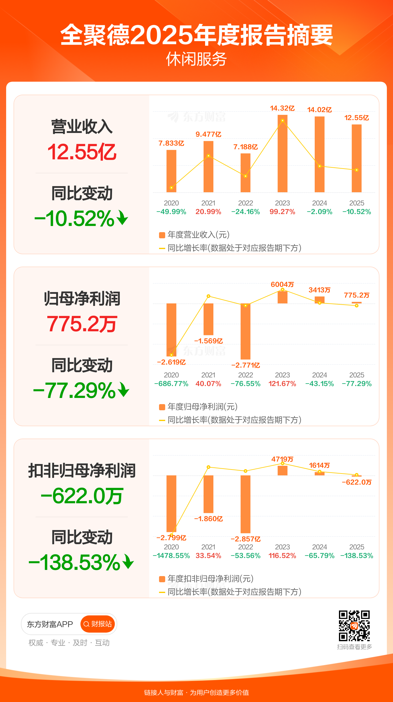 全聚德4月21日发布2025年年报显示,公司全年实现营业收入12.55亿元,同比下滑10.52%;归母净利润775.17万元,同比下滑77.29%;扣非归母净利润-621.96万元。
