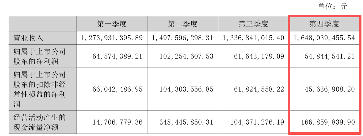 单季度来看,公司第四季度营业收入为16.48亿元,同比增长20.57%;归母净利润为5484.45万元,同比下降23.88%;扣非净利润为4563.69万元,同比下降35.83%。