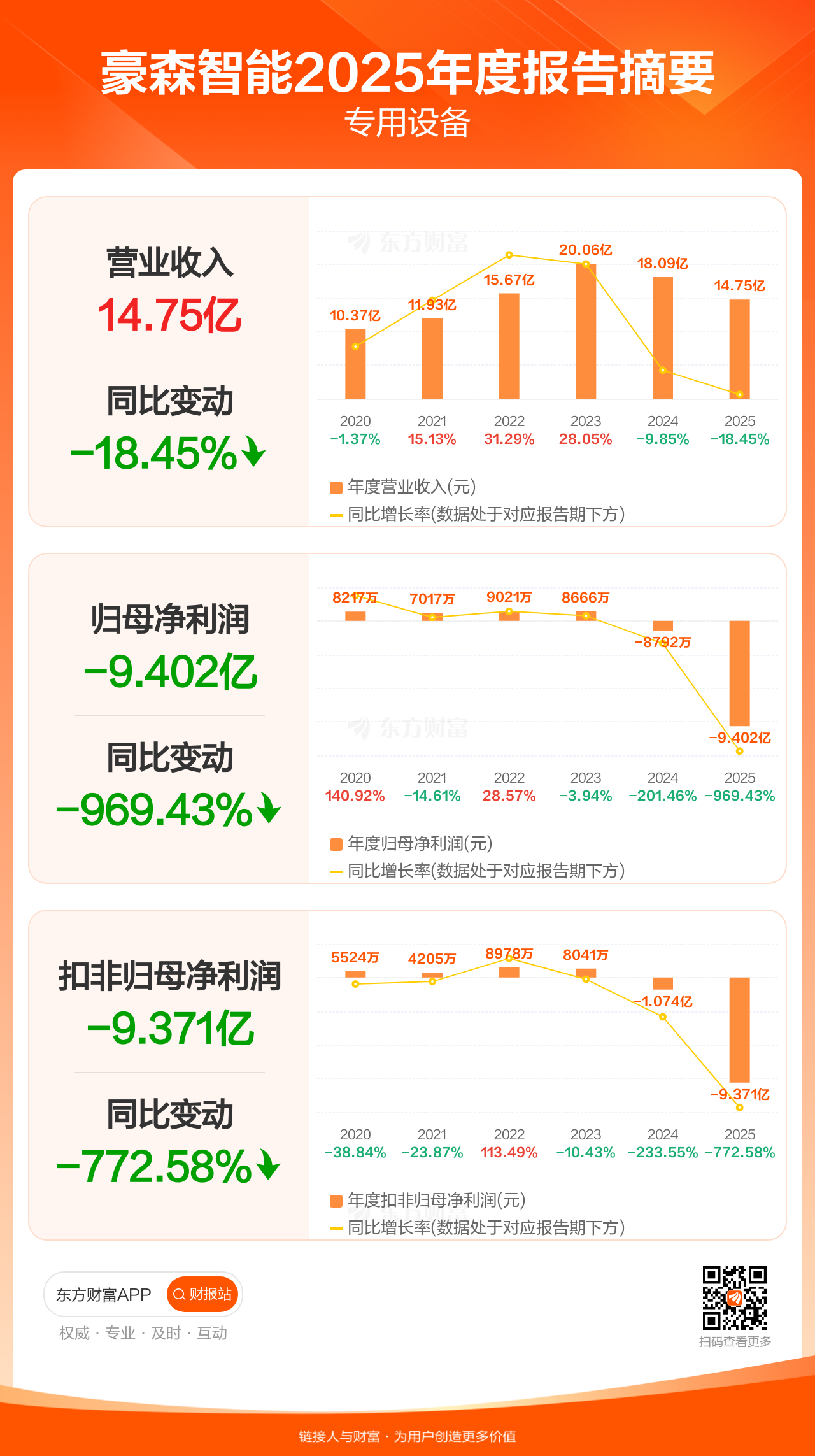 豪森智能4月21日发布2025年年报显示,公司全年实现营业收入14.75亿元,同比下滑18.45%;归母净利润-9.40亿元;扣非归母净利润-9.37亿元。