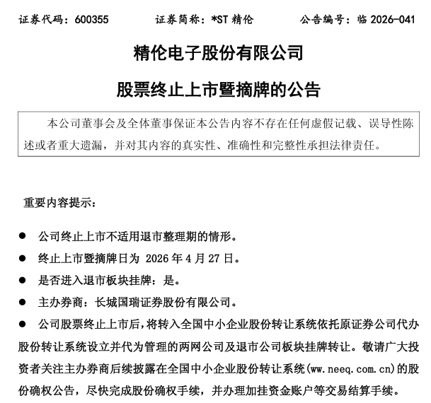 *ST精伦(600355)4月20日晚间公告,公司于2026年4月20日收到上海证券交易所(简称“上交所”)出具的《关于精伦电子股份有限公司股票终止上市的决定》(简称《终止上市决定》),上交所决定终止公司股票上市。