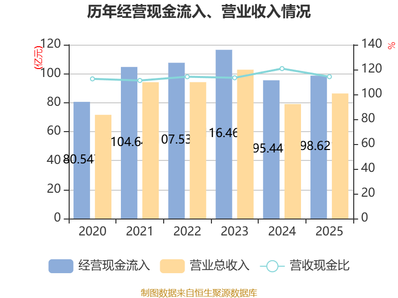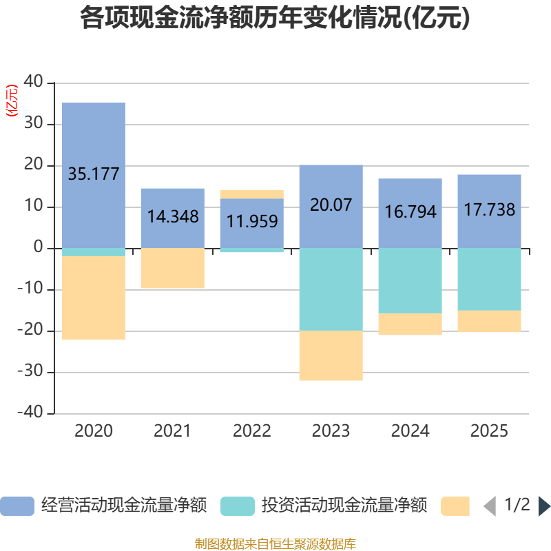 截至2025年,公司经营活动现金流净额为17.74亿元,同比增长5.62%;筹资活动现金流净额-5.21亿元,同比减少487.68万元;投资活动现金流净额-15.15亿元,上年同期为-15.87亿元。