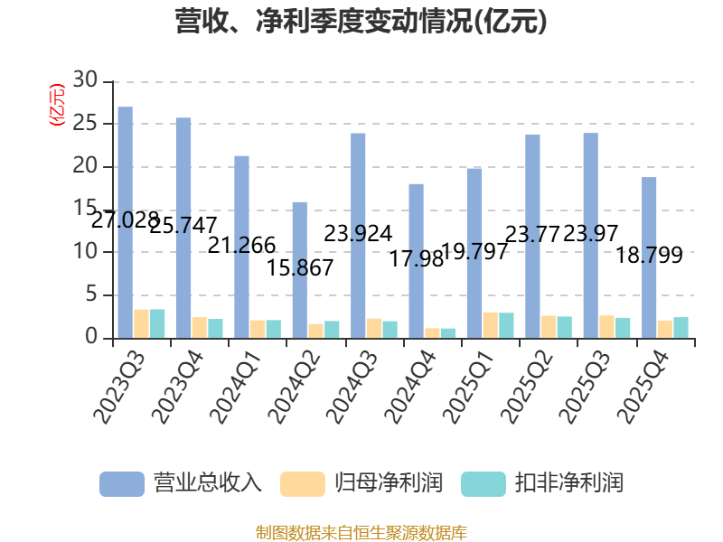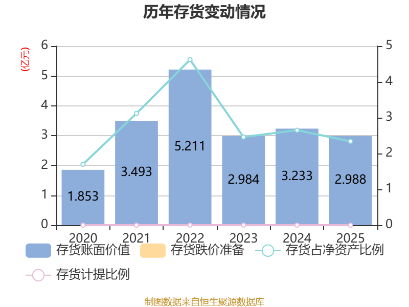 从存货变动来看,截至2025年末,公司存货账面价值为2.99亿元,占净资产的2.34%,较上年末减少2457.5万元。公司本期没有计提存货跌价准备。