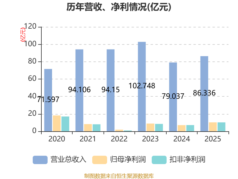 中证智能财讯宝新能源(000690)4月21日披露2025年年度报告。2025年,公司实现营业总收入86.34亿元,同比增长9.23%;归母净利润10.24亿元,同比增长45.21%;扣非净利润10.22亿元,同比增长43.59%;经营活动产生的现金流量净额为17.74亿元,同比增长5.62%;报告期内,宝新能源基本每股收益为0.47元,加权平均净资产收益率为8.21%。公司2025年度分配预案为:拟向全体股东每10股派现2元(含税)。