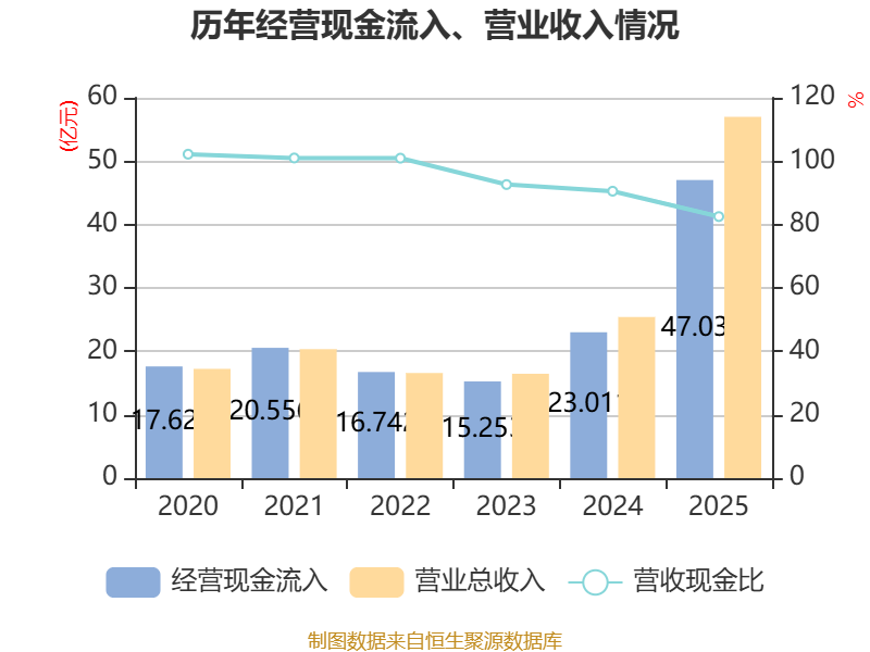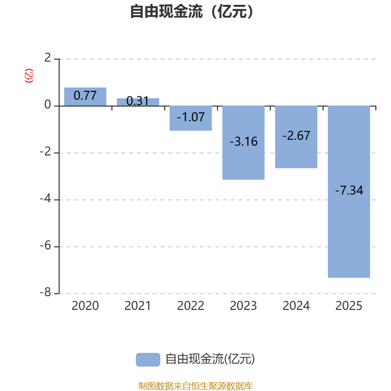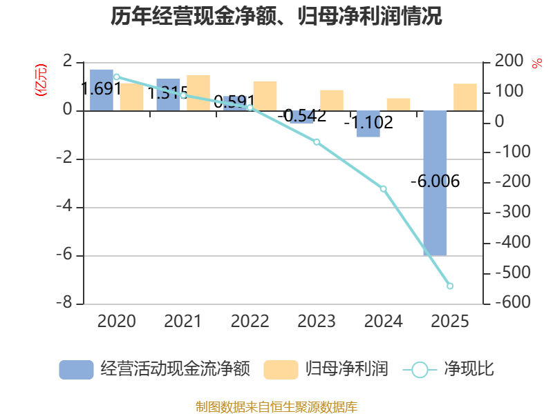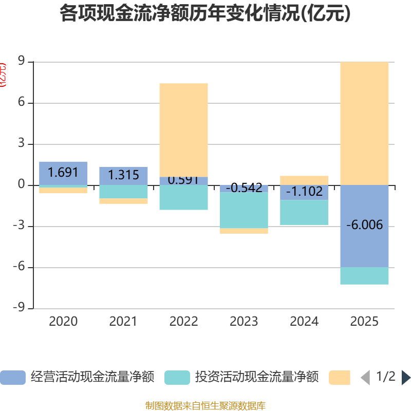 截至2025年,公司经营活动现金流净额为-6.01亿元,同比减少4.9亿元;筹资活动现金流净额8.98亿元,同比增加8.32亿元;投资活动现金流净额-1.26亿元,上年同期为-1.82亿元。
