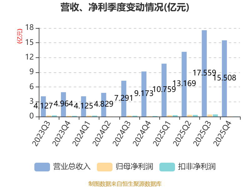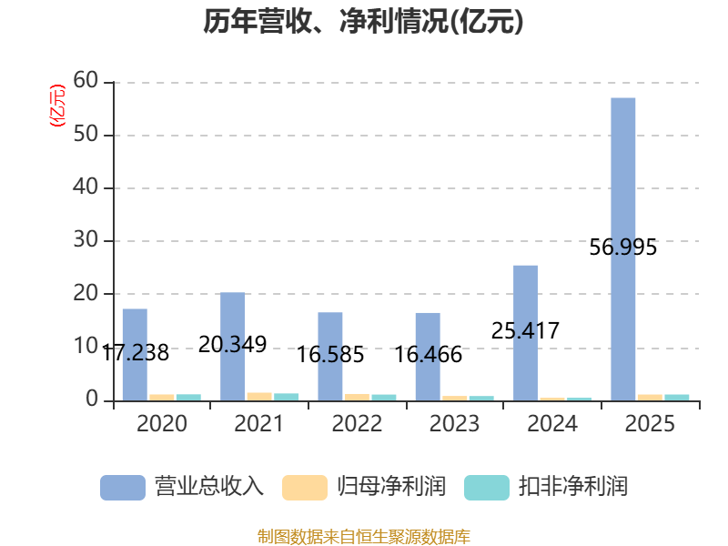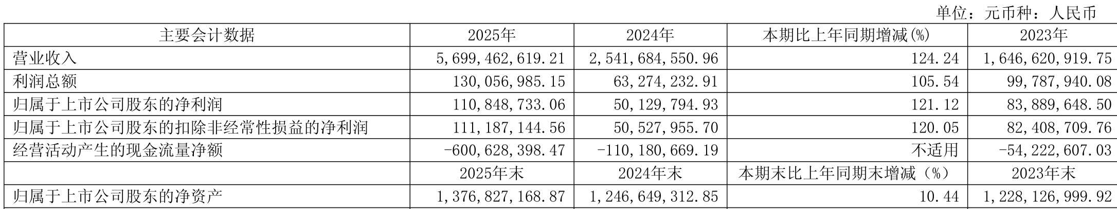 中证智能财讯邦基科技(603151)4月21日披露2025年年度报告。2025年,公司实现营业总收入56.99亿元,同比增长124.24%;归母净利润1.11亿元,同比增长121.12%;扣非净利润1.11亿元,同比增长120.05%;经营活动产生的现金流量净额为-6.01亿元,上年同期为-1.1亿元;报告期内,邦基科技基本每股收益为0.6539元,加权平均净资产收益率为8.46%。公司2025年度分配预案为:拟向全体股东每10股派现1.5元(含税)。