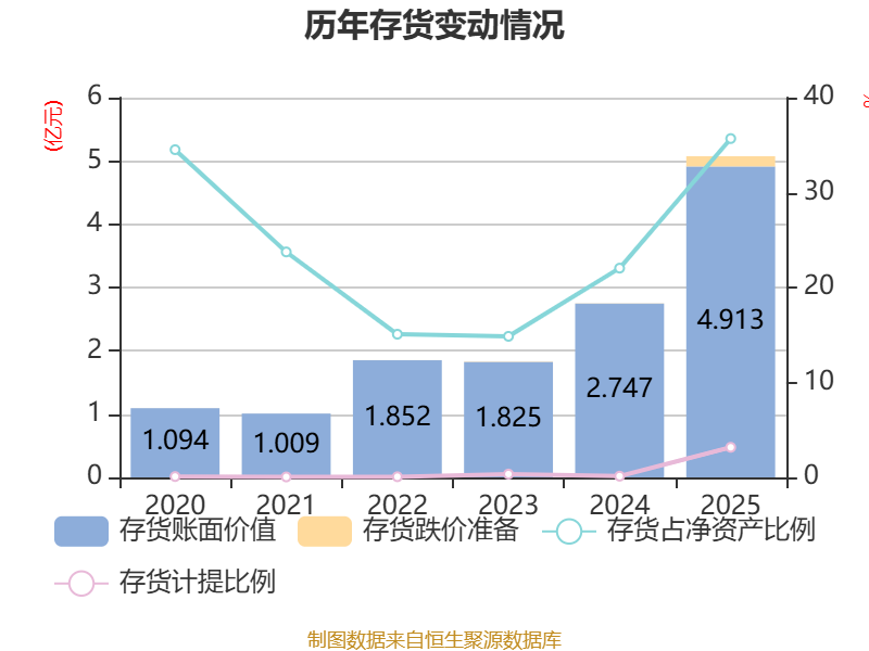 从存货变动来看,截至2025年末,公司存货账面价值为4.91亿元,占净资产的35.69%,较上年末增加2.17亿元。其中,存货跌价准备为1609.09万元,计提比例为3.17%。