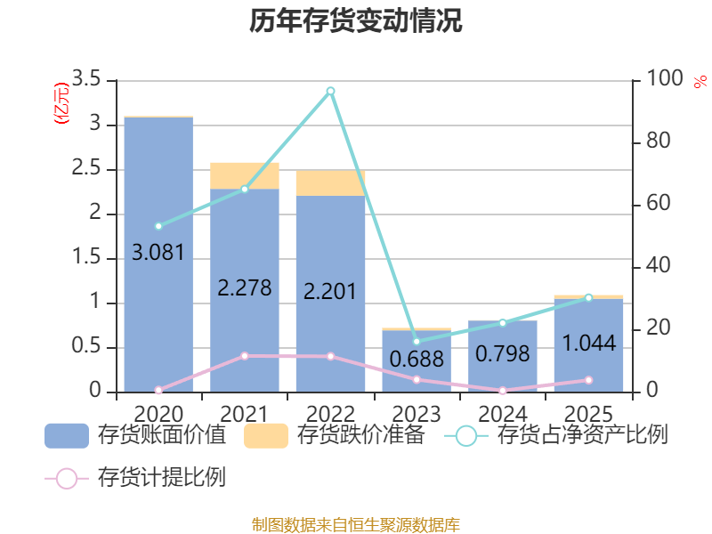 从存货变动来看,截至2025年末,公司存货账面价值为1.04亿元,占净资产的30.08%,较上年末增加2457.19万元。其中,存货跌价准备为399.23万元,计提比例为3.68%。