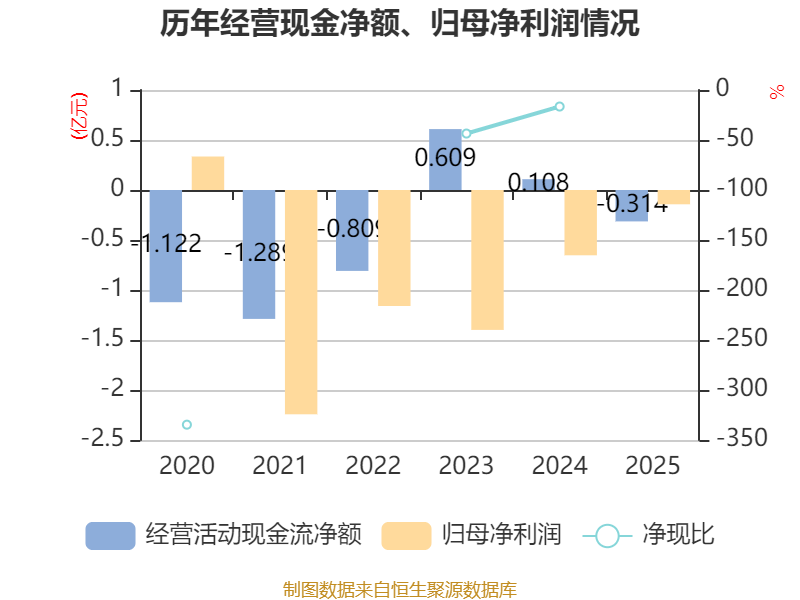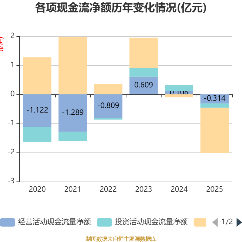 截至2025年,公司经营活动现金流净额为-3137.21万元,同比减少4216.77万元;筹资活动现金流净额-1.56亿元,同比减少1.46亿元;投资活动现金流净额-1433.54万元,上年同期为2062.23万元。