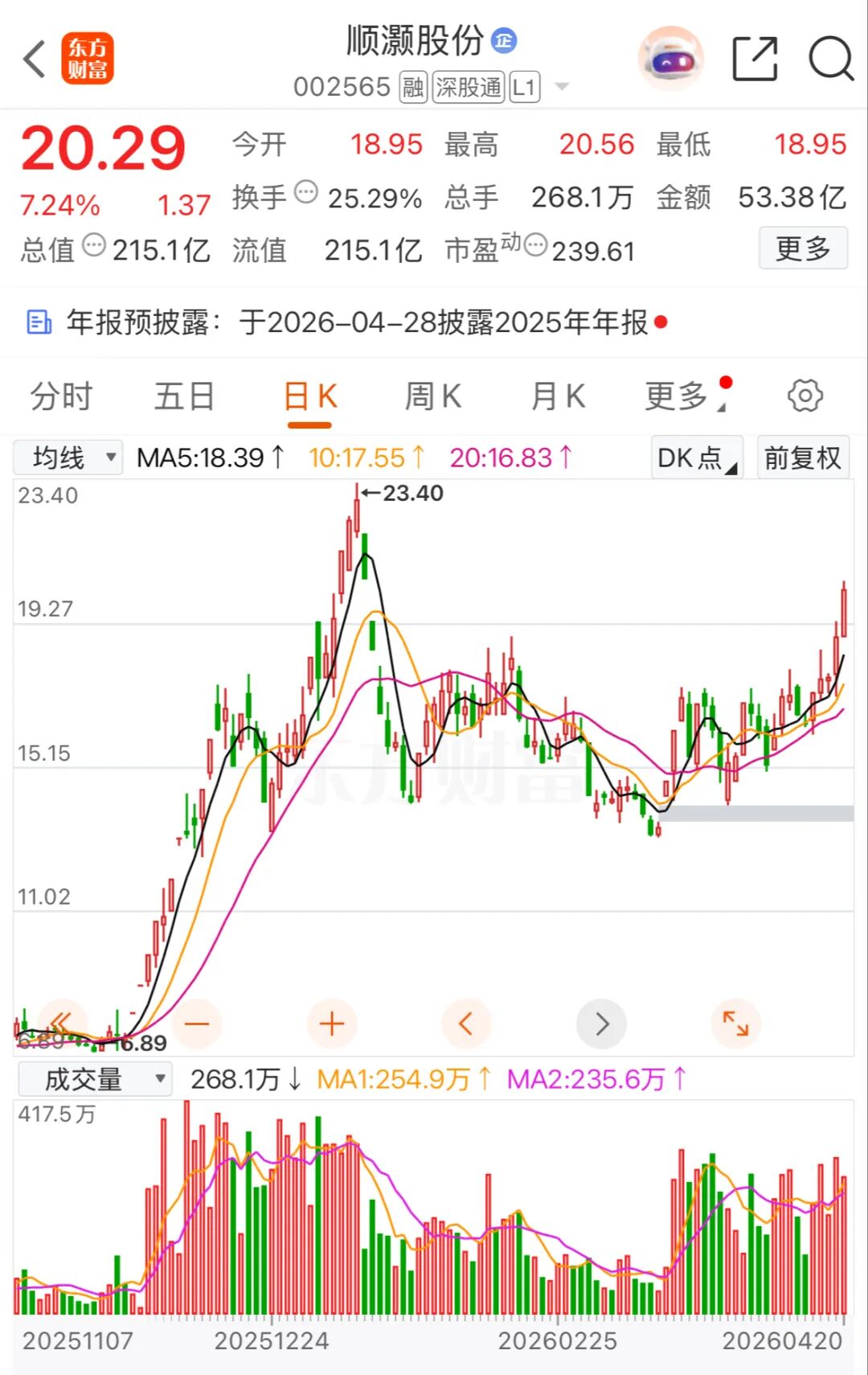 在2025年11月启动的A股商业航天板块上涨行情中,顺灏股份作为太空算力热股,股价上涨超200%,2026年1月达到历史高点23.40元/股,随后持续调整。截至4月20日收盘,其股价报20.29元/股,当日收涨7.24%。