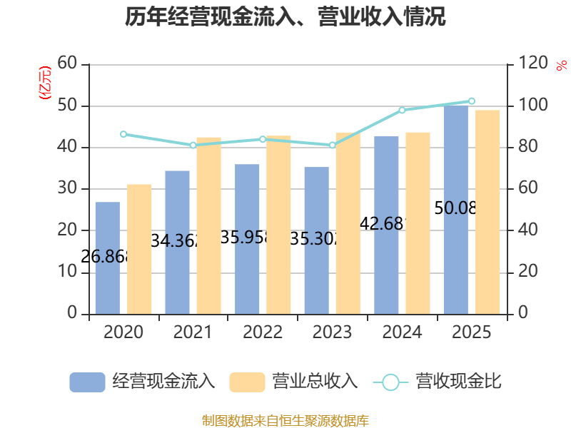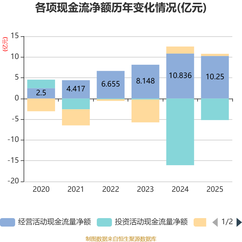 截至2025年,公司经营活动现金流净额为10.25亿元,同比下降5.41%;筹资活动现金流净额5322.18万元,同比减少1.17亿元;投资活动现金流净额-5.19亿元,上年同期为-16.07亿元。