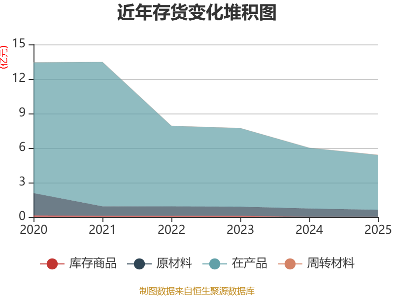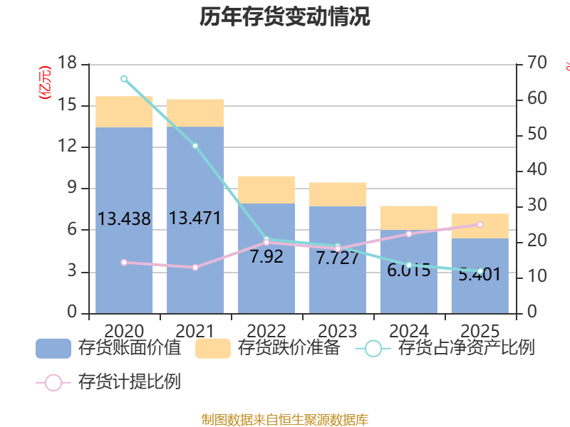 从存货变动来看,截至2025年末,公司存货账面价值为5.4亿元,占净资产的11.82%,较上年末减少6138.77万元。其中,存货跌价准备为1.79亿元,计提比例为24.89%。