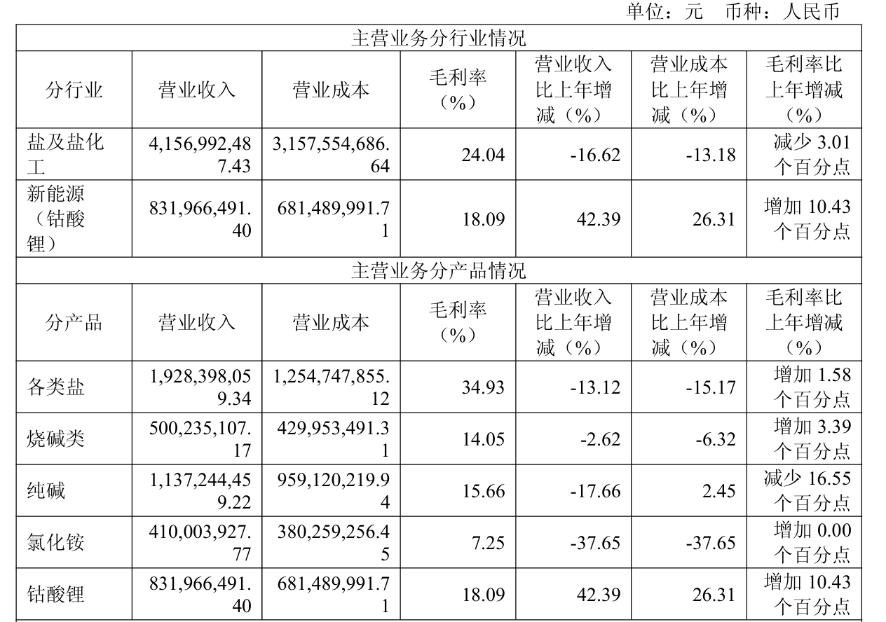 从收入结构来看,盐及盐化工为传统主业,营收占比超八成,但同比下滑16.62%,毛利率下降3.01个百分点,成本降幅13.18%不及收入降幅,盈利空间遭双向挤压;新能源板块异军突起,营收同比大增42.39%的同时,毛利率提升10.43个百分点,成为增长新引擎。