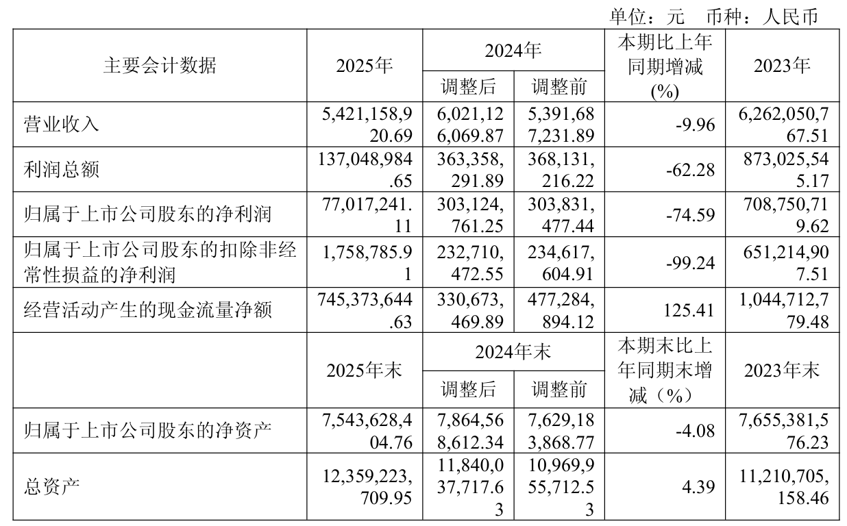 4月20日晚间,雪天盐业(600929)发布2025年年度报告,公司营业收入为54.21亿元,同比下降9.96%;归母净利润为7701.72万元,同比下降74.59%;扣非净利润仅为175.88万元,同比下降99.24%。