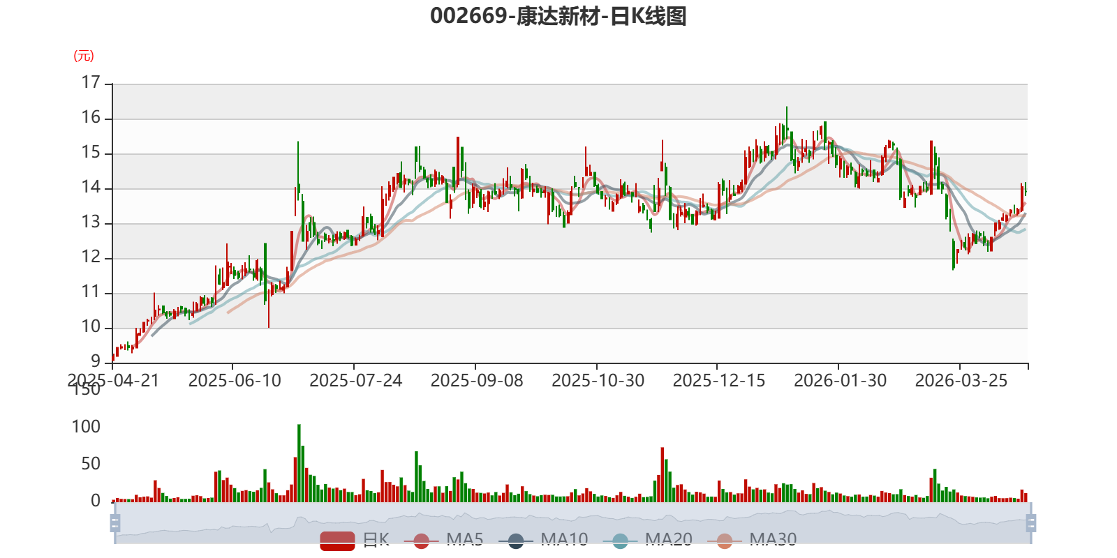 值得注意的是,中登公司数据显示,截至2026年4月17日,康达新材11.68%股份处于质押状态。年报显示,第一大股东唐山工业控股集团有限公司质押3295.86万股公司股份,占其全部持股的37.7%。