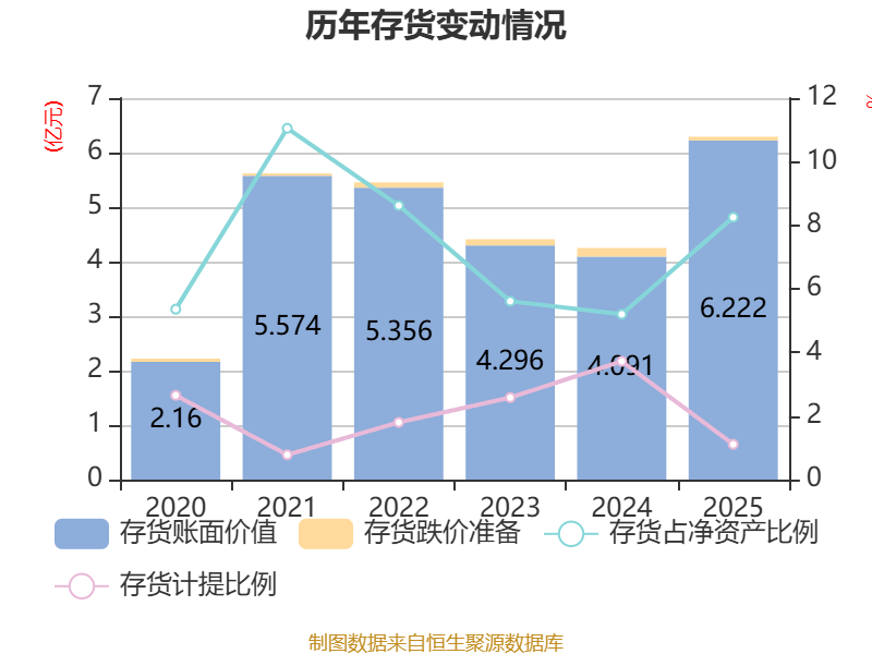 从存货变动来看,截至2025年末,公司存货账面价值为6.22亿元,占净资产的8.25%,较上年末增加2.13亿元。其中,存货跌价准备为695.44万元,计提比例为1.11%。