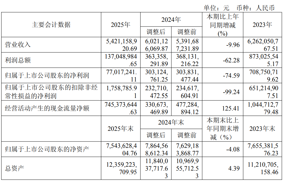 中证智能财讯雪天盐业(600929)4月21日披露2025年年度报告。2025年,公司实现营业总收入54.21亿元,同比下降9.96%;归母净利润7701.72万元,同比下降74.59%;扣非净利润175.88万元,同比下降99.24%;经营活动产生的现金流量净额为7.45亿元,同比增长125.41%;报告期内,雪天盐业基本每股收益为0.047元,加权平均净资产收益率为0.98%。公司2025年度分配预案为:拟向全体股东每10股派现0.15元(含税)。