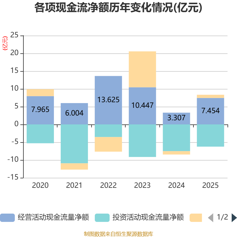 截至2025年,公司经营活动现金流净额为7.45亿元,同比增长125.41%;筹资活动现金流净额8901.03万元,同比增加1.84亿元;投资活动现金流净额-6.25亿元,上年同期为-7.51亿元。
