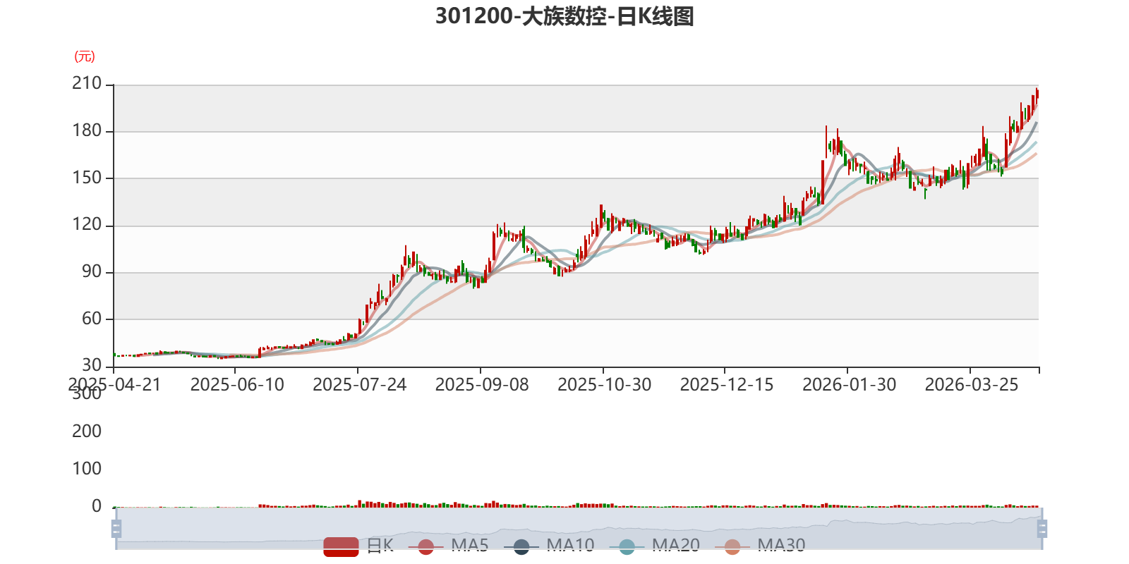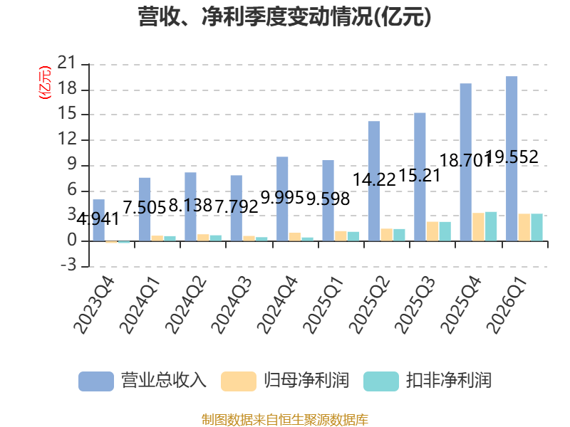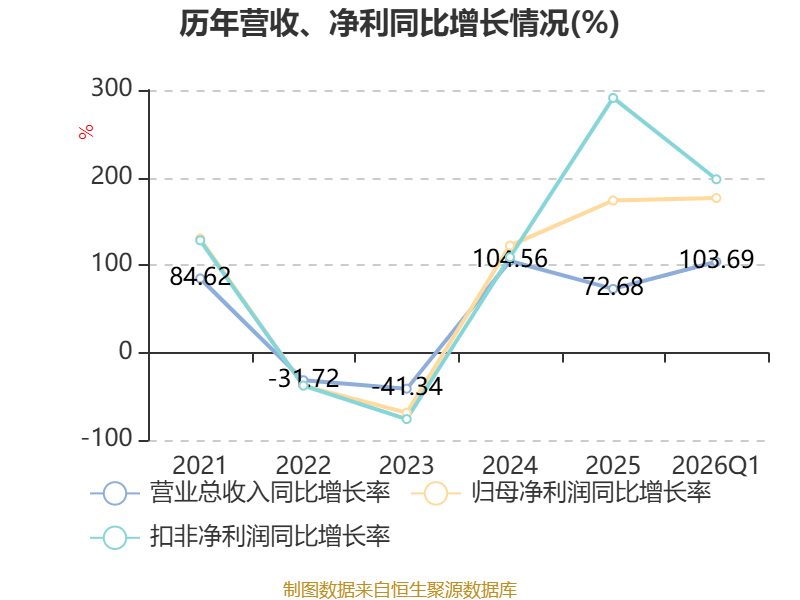 中证智能财讯大族数控(301200)4月21日披露2026年第一季度报告。公司实现营业总收入19.55亿元,同比增长103.69%;归母净利润3.23亿元,同比增长176.53%;扣非净利润3.23亿元,同比增长197.94%;经营活动产生的现金流量净额为-6.46亿元,上年同期为-3.35亿元;报告期内,大族数控基本每股收益为0.73元,加权平均净资产收益率为3.74%。