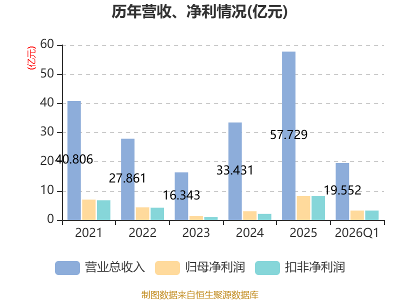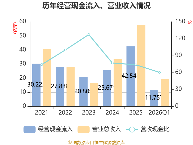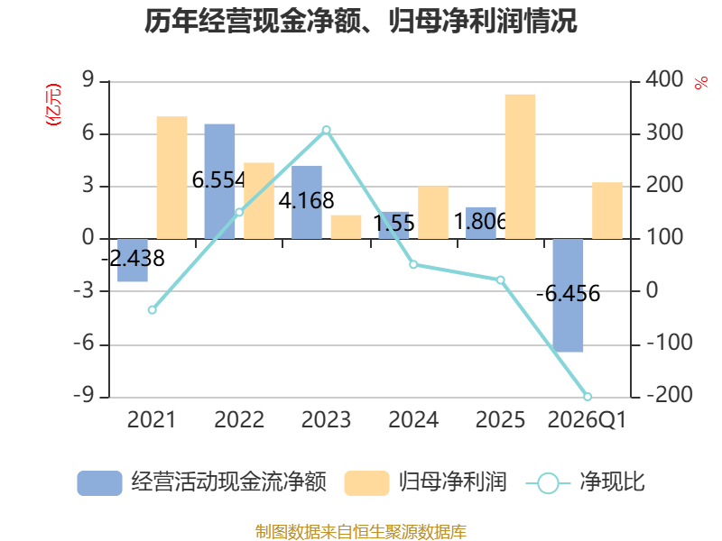 截至2026年一季度末,公司经营活动现金流净额为-6.46亿元,同比减少3.1亿元;筹资活动现金流净额45.83亿元,同比增加35.37亿元;投资活动现金流净额-4168.84万元,上年同期为-4194.81万元。