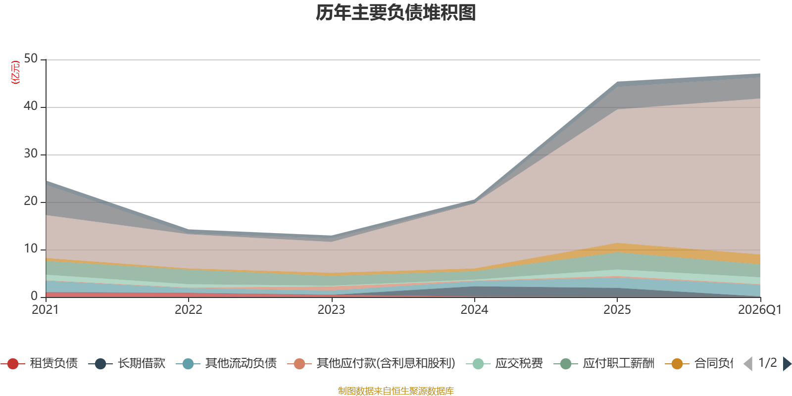 负债重大变化方面,截至2026年一季度末,公司应付票据及应付账款较上年末增加16.82%,占公司总资产比重下降5.85个百分点;长期借款较上年末减少100%,占公司总资产比重下降1.7个百分点;应付职工薪酬较上年末减少24.5%,占公司总资产比重下降1.69个百分点;短期借款较上年末减少5.78%,占公司总资产比重下降1.66个百分点。
