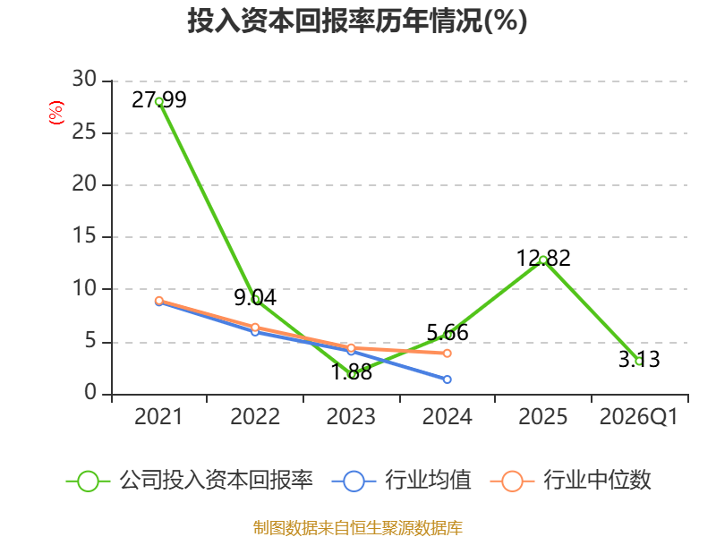 盈利能力方面, 2026年一季度公司加权平均净资产收益率为3.74%,同比上升1.49个百分点。公司2026年第一季度投入资本回报率为3.13%,较上年同期上升1.2个百分点。
