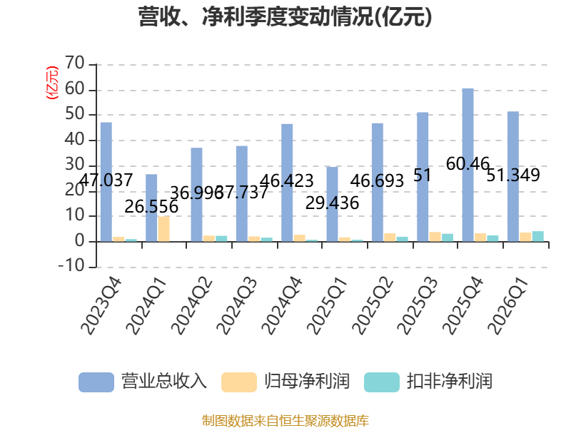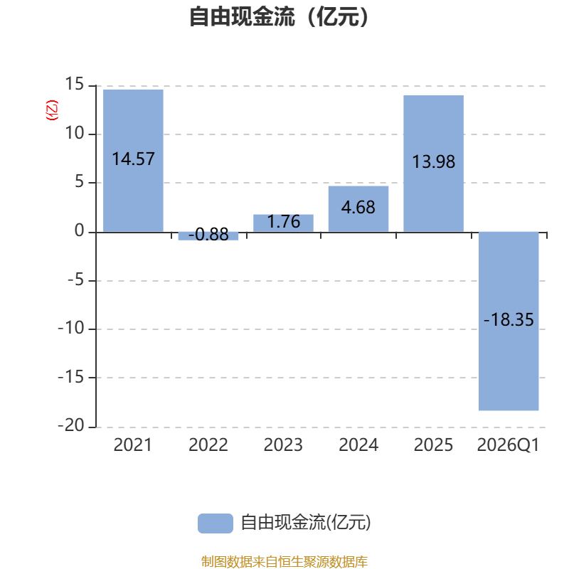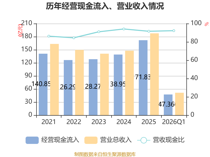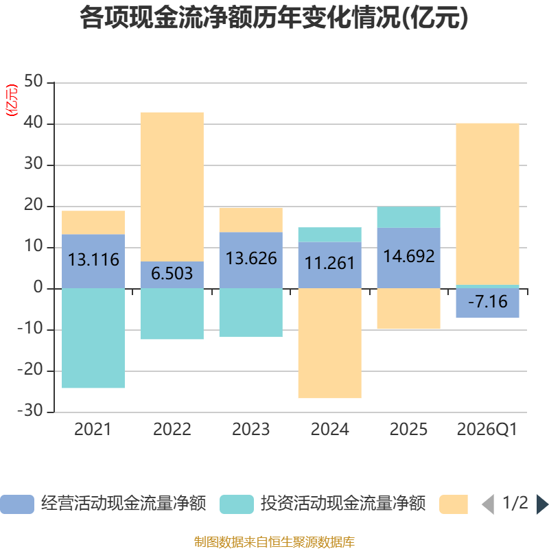 截至2026年一季度末,公司经营活动现金流净额为-7.16亿元,同比减少5896.81万元;筹资活动现金流净额39.21亿元,同比增加23.95亿元;投资活动现金流净额8489.45万元,上年同期为8.01亿元。