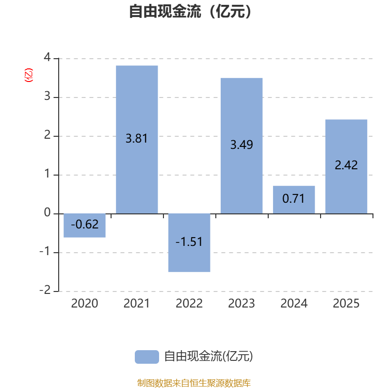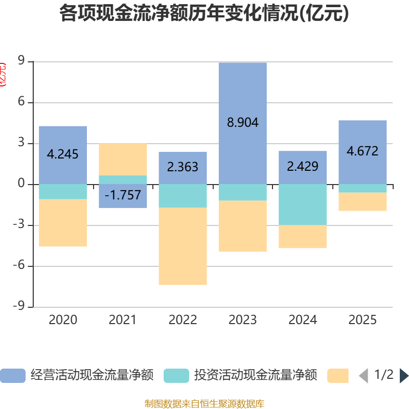 截至2025年,公司经营活动现金流净额为4.67亿元,同比增长92.36%;筹资活动现金流净额-1.34亿元,同比增加3482.21万元;投资活动现金流净额-6270.06万元,上年同期为-3.01亿元。