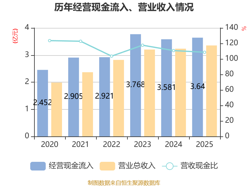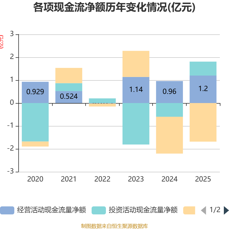 截至2025年,公司经营活动现金流净额为1.2亿元,同比增长24.96%;筹资活动现金流净额-1.69亿元,同比减少770.68万元;投资活动现金流净额6088.14万元,上年同期为-5985.44万元。