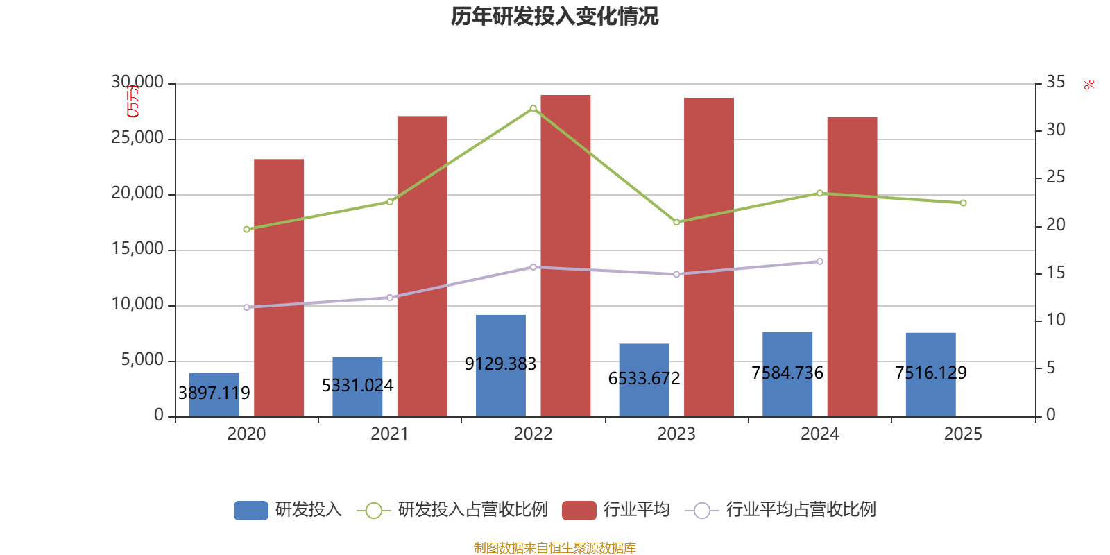 2025年全年,公司研发投入金额为7516.13万元,同比下降0.9%;研发投入占营业收入比例为22.42%,相比上年同期下降1.03个百分点。