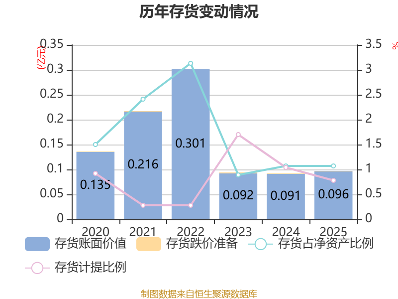 从存货变动来看,截至2025年末,公司存货账面价值为961.64万元,占净资产的1.07%,较上年末增加54.87万元。其中,存货跌价准备为7.56万元,计提比例为0.78%。