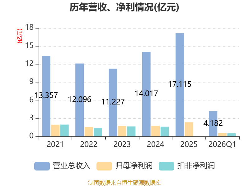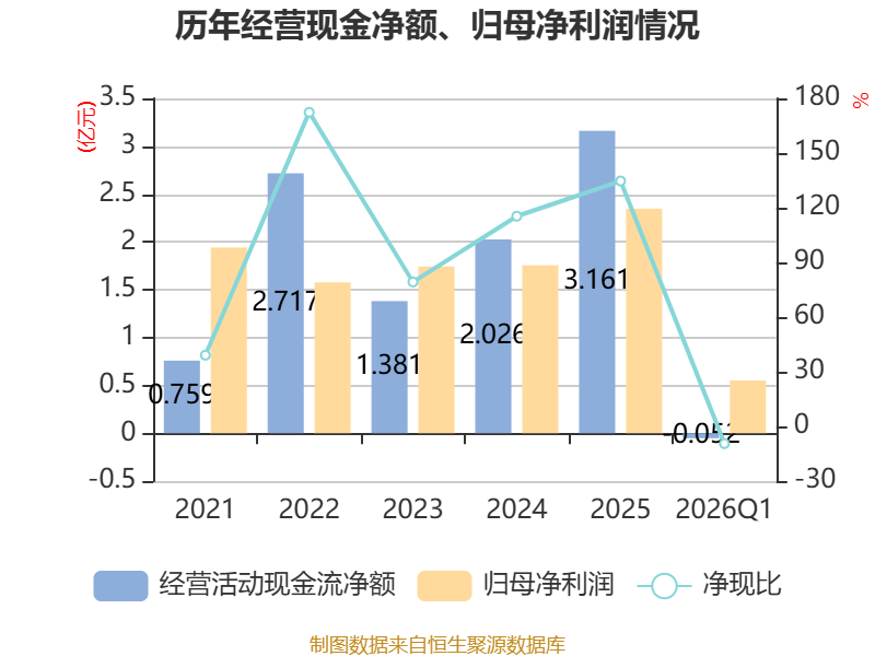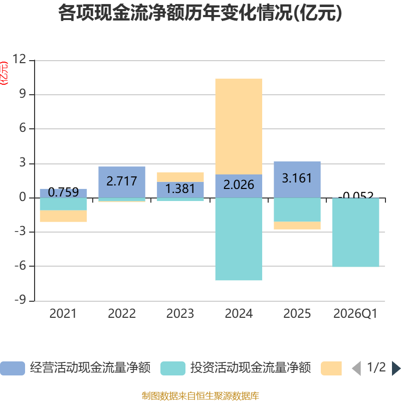 截至2026年一季度末,公司经营活动现金流净额为-521.2万元,同比减少2741.55万元;筹资活动现金流净额-34.81万元,同比增加8.05万元;投资活动现金流净额-5.99亿元,上年同期为-7.52亿元。