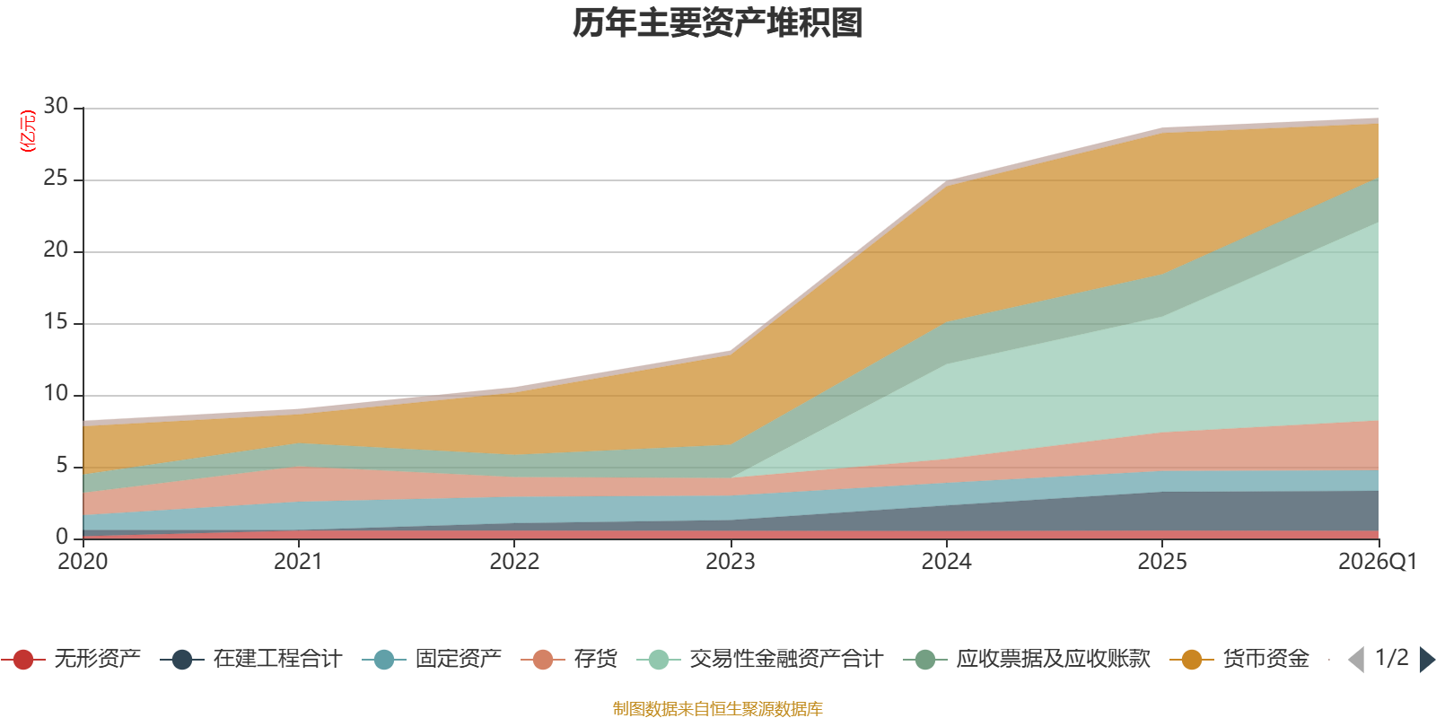 资产重大变化方面,截至2026年一季度末,公司货币资金较上年末减少61.78%,占公司总资产比重下降21.54个百分点;交易性金融资产合计较上年末增加71.47%,占公司总资产比重上升19个百分点;存货较上年末增加29.27%,占公司总资产比重上升2.47个百分点;应收票据及应收账款较上年末增加4.99%,占公司总资产比重上升0.27个百分点。