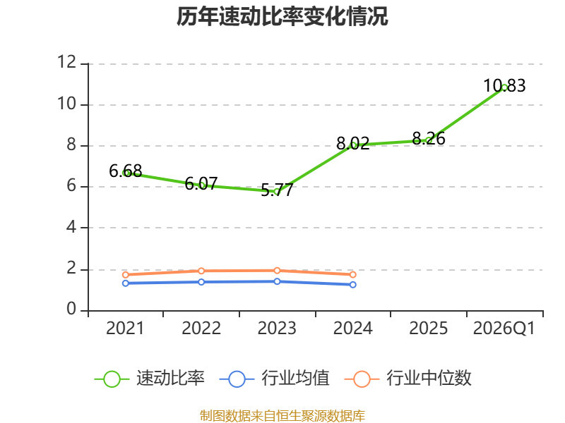 2026年第一季度,公司流动比率为10.88,速动比率为10.83。