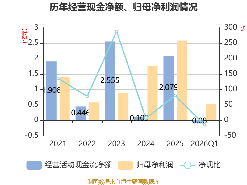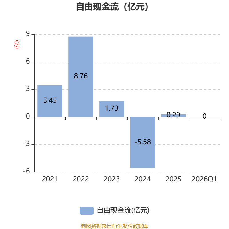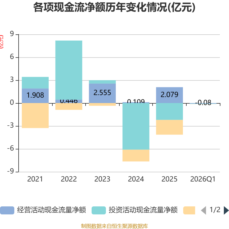 截至2026年一季度末,公司经营活动现金流净额为-796.03万元,同比减少4223.98万元;筹资活动现金流净额-123.97万元,同比减少91.44万元;投资活动现金流净额-383.63万元,上年同期为1739.97万元。