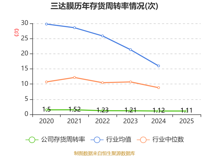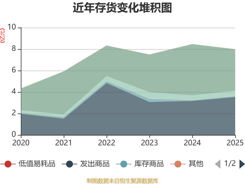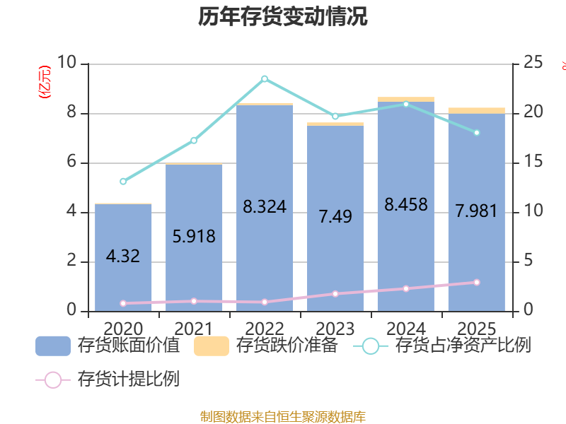 从存货变动来看,截至2025年末,公司存货账面价值为7.98亿元,占净资产的18.02%,较上年末减少4768.67万元。其中,存货跌价准备为2371.99万元,计提比例为2.89%。
