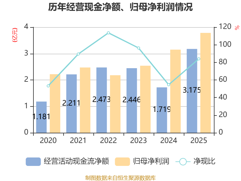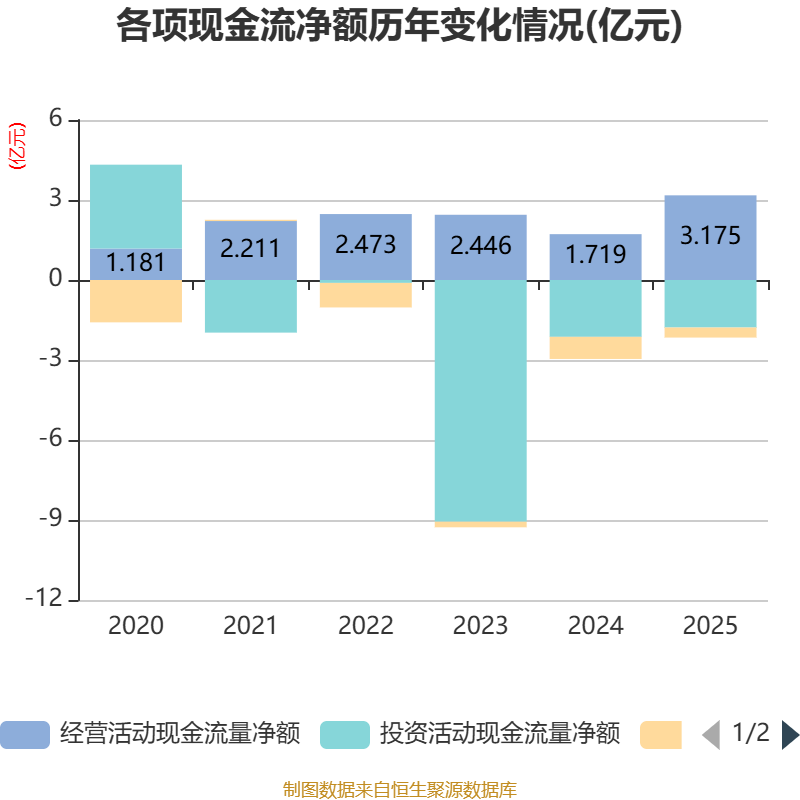 截至2025年,公司经营活动现金流净额为3.18亿元,同比增长84.7%;筹资活动现金流净额-3774.38万元,同比增加4523.6万元;投资活动现金流净额-1.78亿元,上年同期为-2.13亿元。