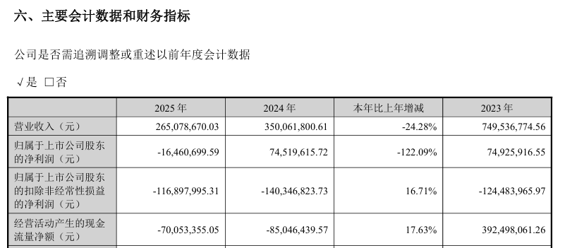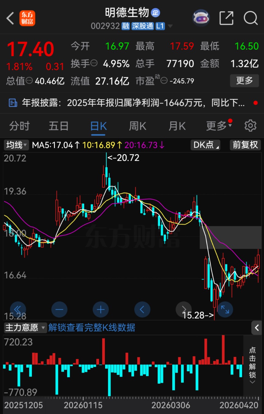 4月20日晚间,明德生物披露2025年年报。2025年年报显示,明德生物2025年度利润总额亏损6379.40万元,归母净利润亏损1646.07万元,扣非后净利润亏损1.17亿元,营业收入为2.65亿元,扣除后的营业收入为2.41亿元。