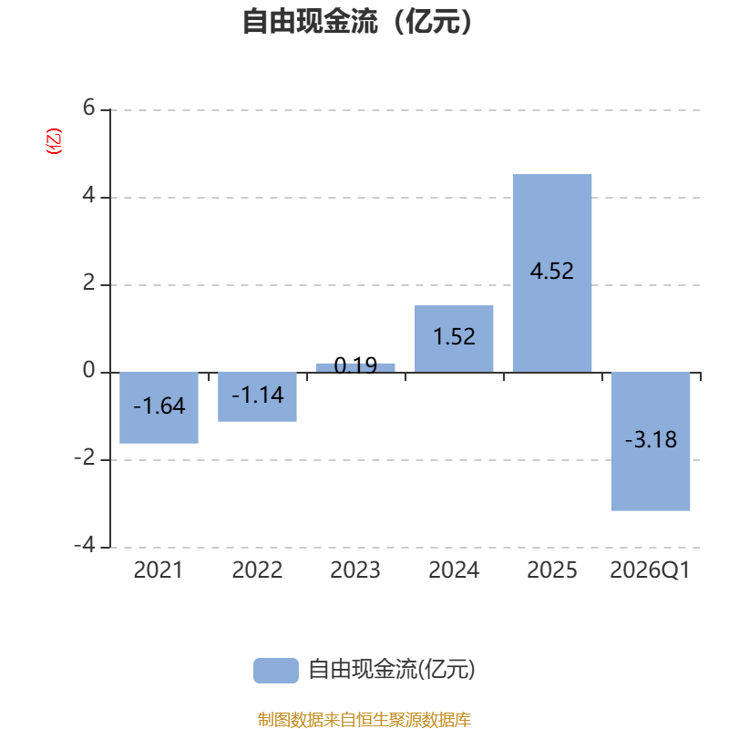 截至2026年一季度末,公司经营活动现金流净额为-450.17万元,同比减少513.67万元;筹资活动现金流净额-167.5万元,同比减少167.5万元;投资活动现金流净额-2.39亿元,上年同期为1374.21万元。