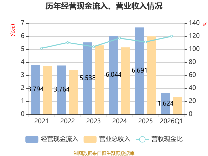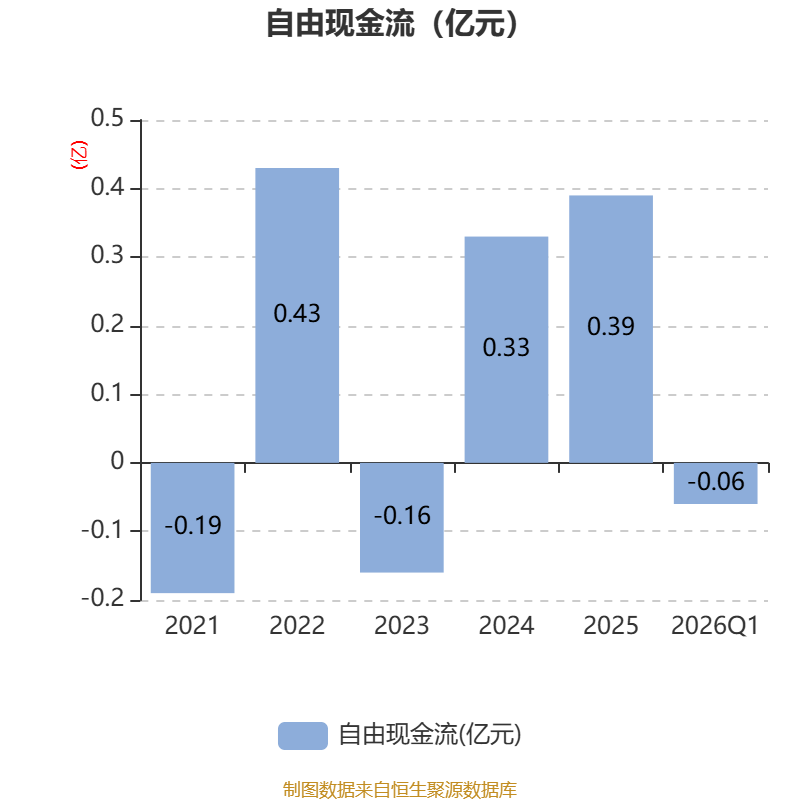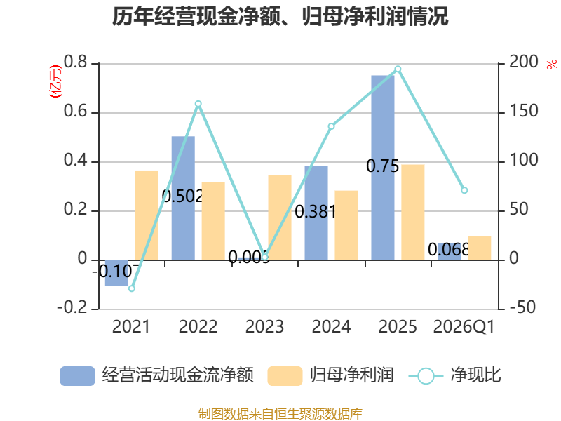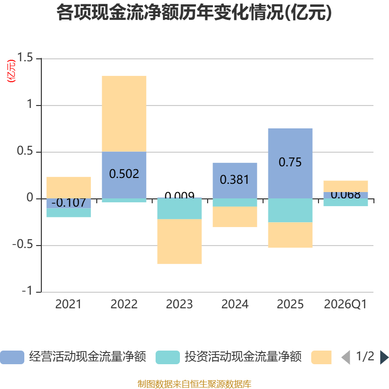 截至2026年一季度末,公司经营活动现金流净额为682.24万元,同比下降45.62%;筹资活动现金流净额1219.57万元,同比增加2391.26万元;投资活动现金流净额-833.57万元,上年同期为-339.12万元。