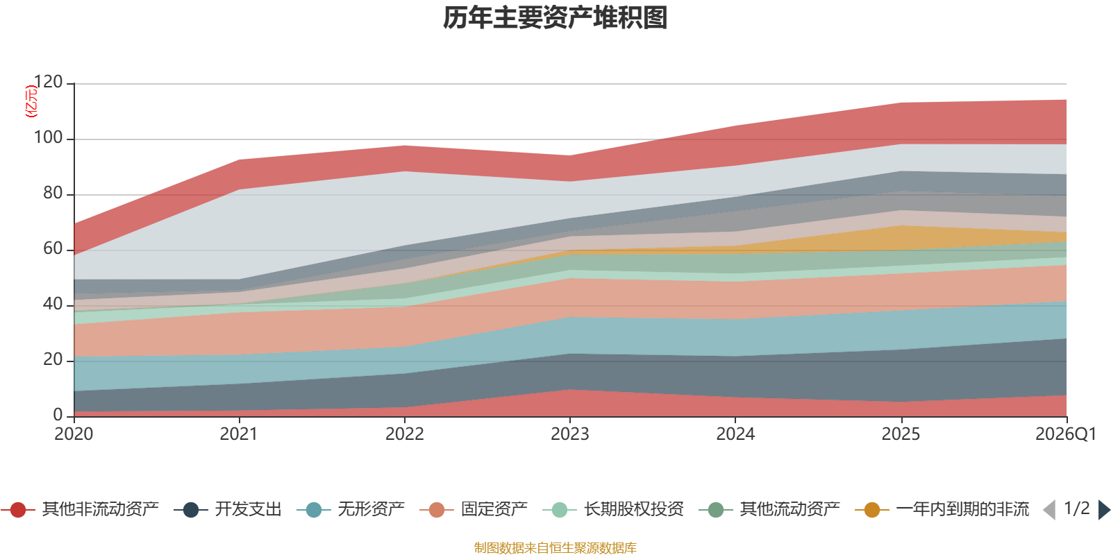 资产重大变化方面,截至2026年一季度末,公司一年内到期的非流动资产较上年末减少62.28%,占公司总资产比重下降4.98个百分点;其他非流动资产较上年末增加46.14%,占公司总资产比重上升2.04个百分点;开发支出较上年末增加8.32%,占公司总资产比重上升1.22个百分点;货币资金较上年末增加11.57%,占公司总资产比重上升0.9个百分点。