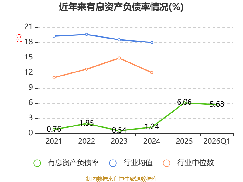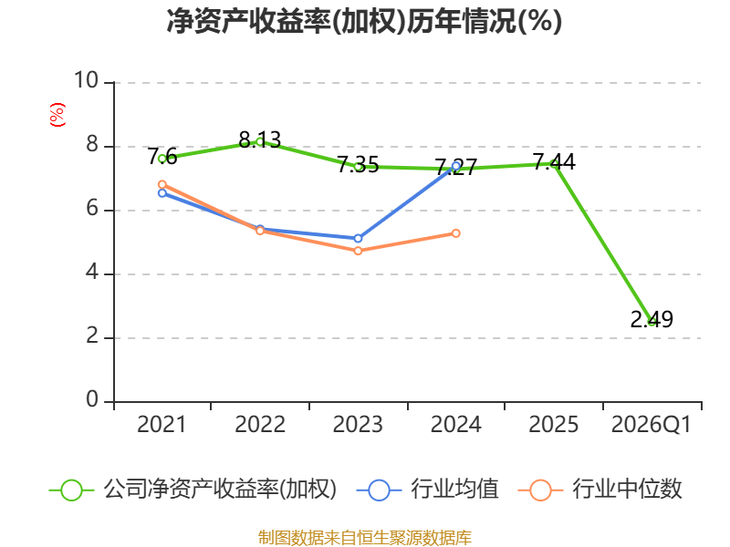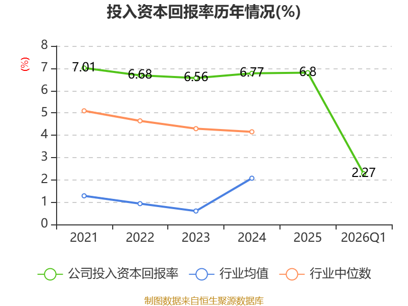 盈利能力方面, 2026年一季度公司加权平均净资产收益率为2.49%,同比上升0.22个百分点。公司2026年第一季度投入资本回报率为2.27%,较上年同期上升0.07个百分点。