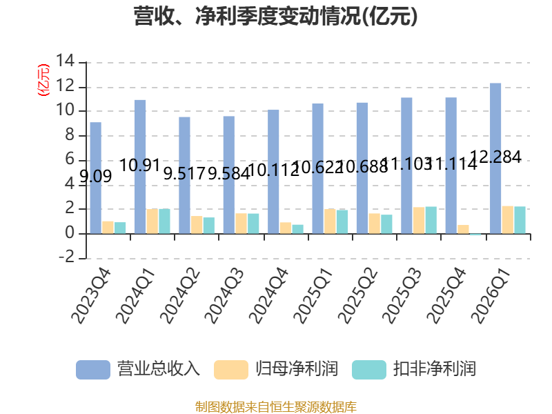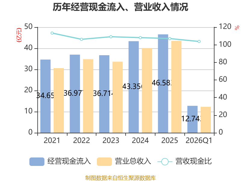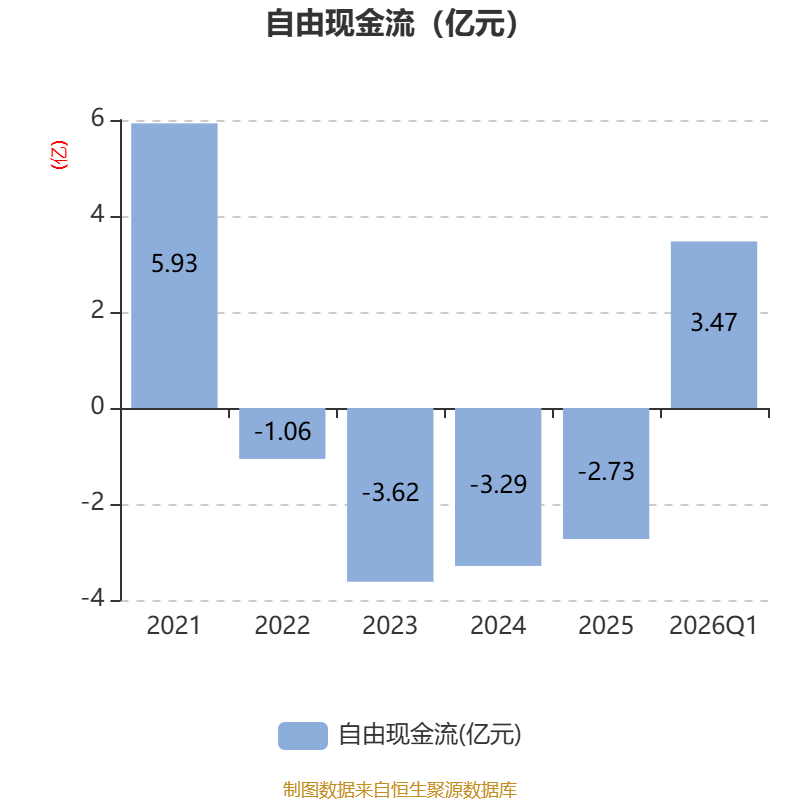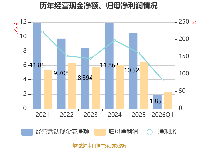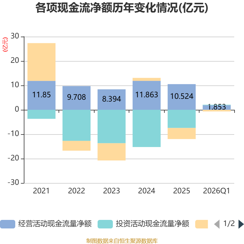 截至2026年一季度末,公司经营活动现金流净额为1.85亿元,同比增长9.38%;筹资活动现金流净额-6620.29万元,同比减少8281.46万元;投资活动现金流净额2211.79万元,上年同期为1.27亿元。