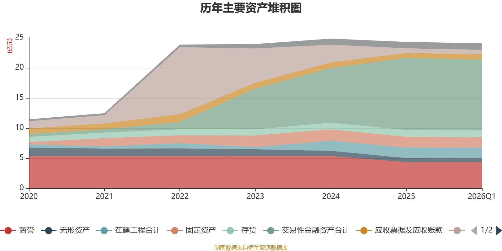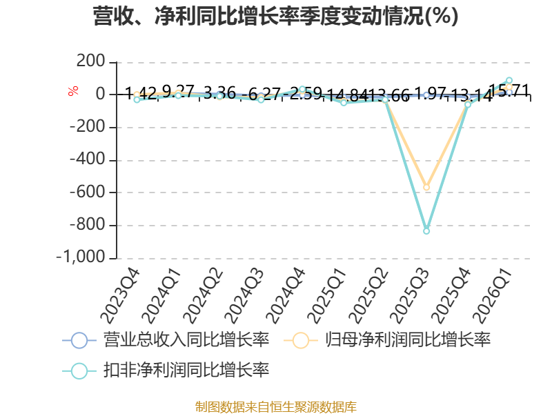 资产重大变化方面,截至2026年一季度末,公司交易性金融资产合计较上年末减少2.19%,占公司总资产比重下降0.61个百分点;应收票据及应收账款较上年末增加14.23%,占公司总资产比重上升0.51个百分点;商誉较上年末没有变化,占公司总资产比重上升0.18个百分点;固定资产较上年末减少2.76%,占公司总资产比重下降0.13个百分点。