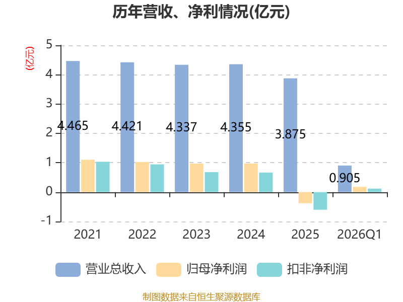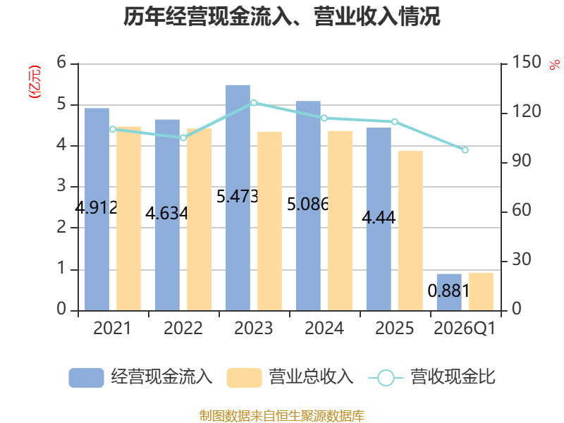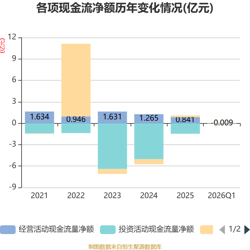 截至2026年一季度末,公司经营活动现金流净额为-90.5万元,同比增加773.93万元;筹资活动现金流净额-400万元,同比减少3554.43万元;投资活动现金流净额215.12万元,上年同期为-5014.98万元。