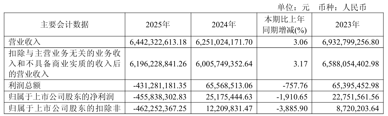 4月20日晚间,六国化工(600470)发布2025年年度报告,公司全年实现营业收入64.42亿元,同比上升3.06%;归母净利润亏损4.56亿元,同比下降1910.65%;扣非净利润亏损4.62亿元,同比下降3885.90%。