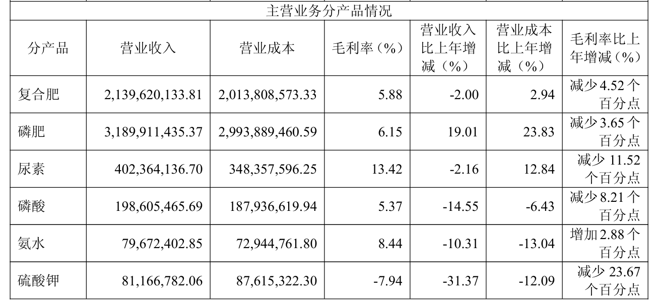 具体产品来看,磷肥占比过半,营收大增19.01%,但毛利率仅6.15%且下滑3.65个百分点;复合肥占比约35%,营收微降2%,但毛利率下滑4.52个百分点至5.88%,两大主力均增收不增利。