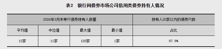 2026年3月末,银行间债券市场的法人机构成员共3878家,全部为金融机构。从持债规模看,公司信用类债券前50名投资者持债占比53.9%,主要集中在公募基金(资管)、国有大型商业银行(自营)、信托公司(资管)等;前200名投资者持债占比85.0%。