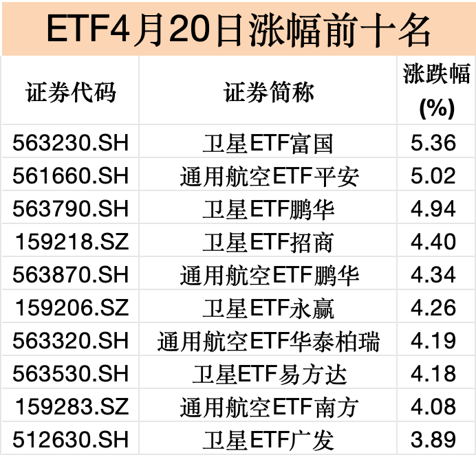 ETF市场涨幅榜也“清一色”被卫星、通用航空等ETF占据。其中,卫星ETF富国、通用航空ETF平安涨超5%,卫星ETF鹏华、卫星ETF招商、通用航空ETF鹏华、卫星ETF永赢、通用航空ETF华泰柏瑞等7只ETF涨超4%。