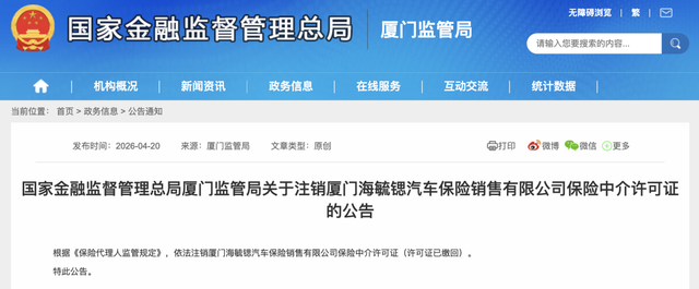 4月20日,国家金融监督管理总局厦门监管局关于注销厦门海毓锶汽车保险销售有限公司保险中介许可证的公告显示,根据《保险代理人监管规定》,依法注销厦门海毓锶汽车保险销售有限公司保险中介许可证(许可证已缴回)。