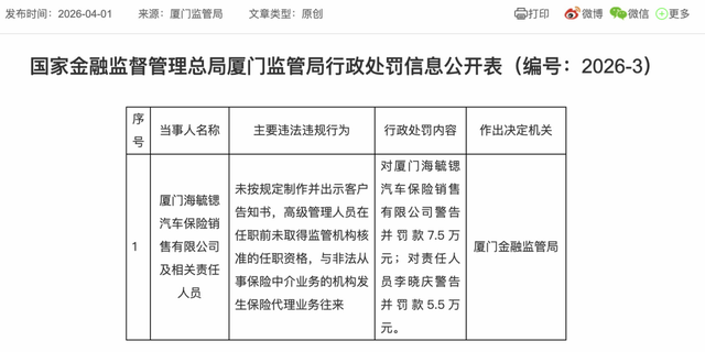 记者注意到,今年4月1日,国家金融监督管理总局厦门监管局行政处罚信息公开表显示,厦门海毓锶汽车保险销售有限公司因未按规定制作并出示客户告知书,高级管理人员在任职前未取得监管机构核准的任职资格,与非法从事保险中介业务的机构发生保险代理业务往来等违法违规行为,被给予警告并罚款7.5万元;责任人李某庆被警告并罚款5.5万元。